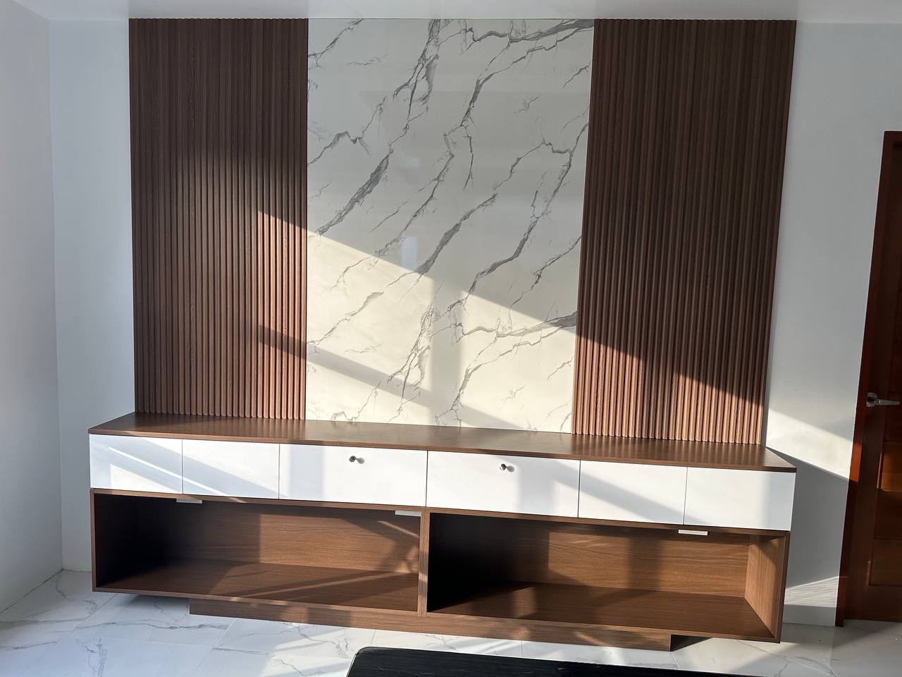Absolutely. STERK Builders creates custom wardrobe cabinets with intelligent compartments, pull-out drawers, and premium finishes. We also design modern TV console cabinets with cable management solutions, display shelving, and hidden storage — all precision-crafted using our advanced CNC machinery.